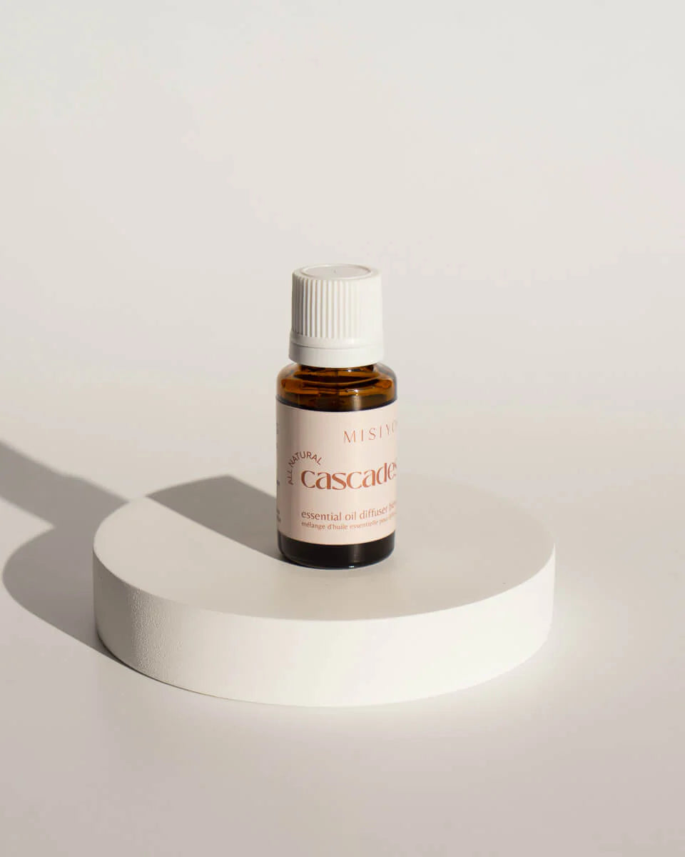 Cascades Diffuser Blend: Bergamot (natural blend), Pogostemon cablin (patchouli) oil, Juniperus virginiana (cedarwood) oil, Lavandula officinalis (lavender) oil