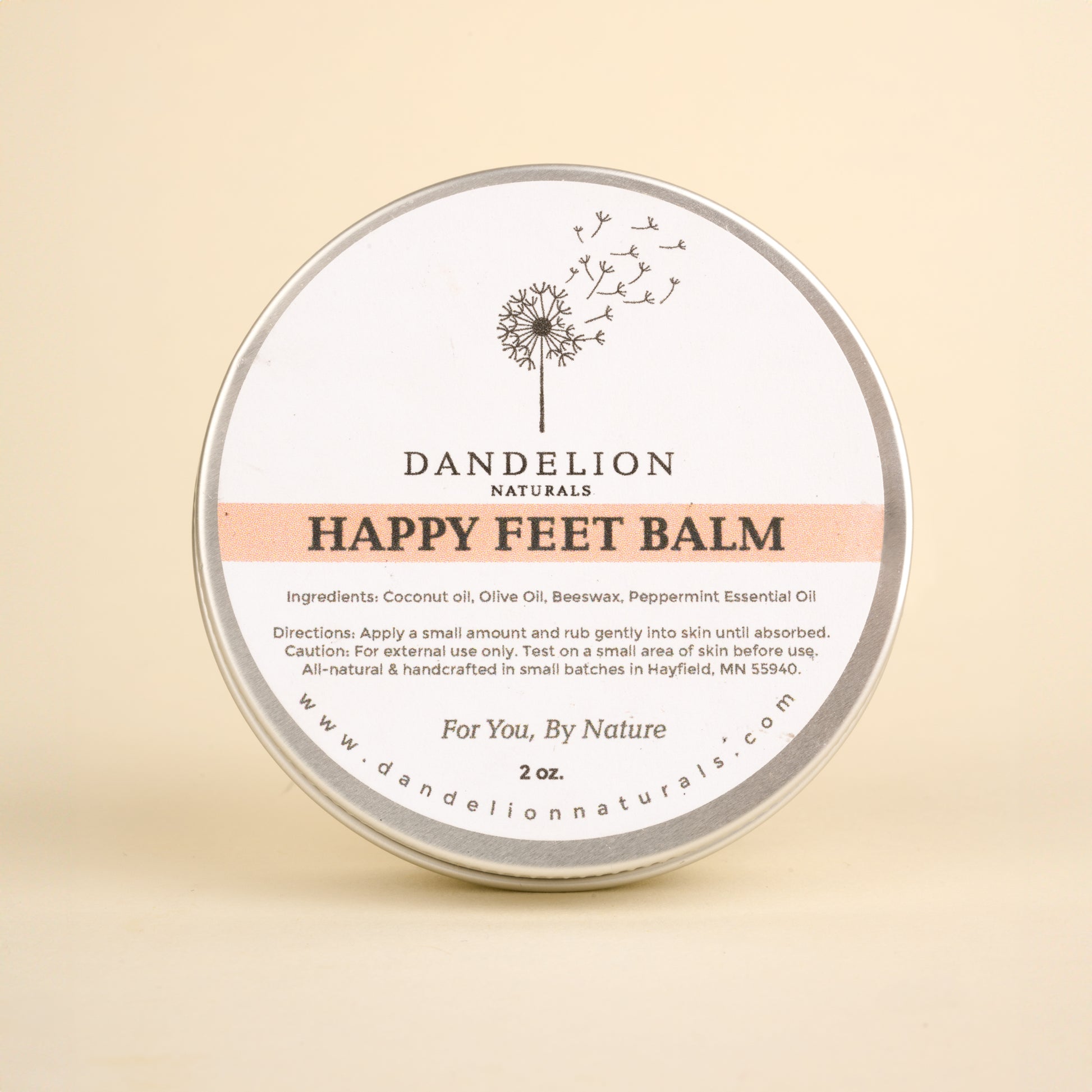 Moisturize and nourish your dry feet and cracked heels naturally with our Happy Feet Balm. The luxurious and concentrated base of coconut oil, olive oil and beeswax will leave your feet feeling soft and renewed. We also add peppermint essential oil to leave your feet feeling invigorated and refreshed. This thick and concentrated formula provides long lasting support. Your feet will thank you!