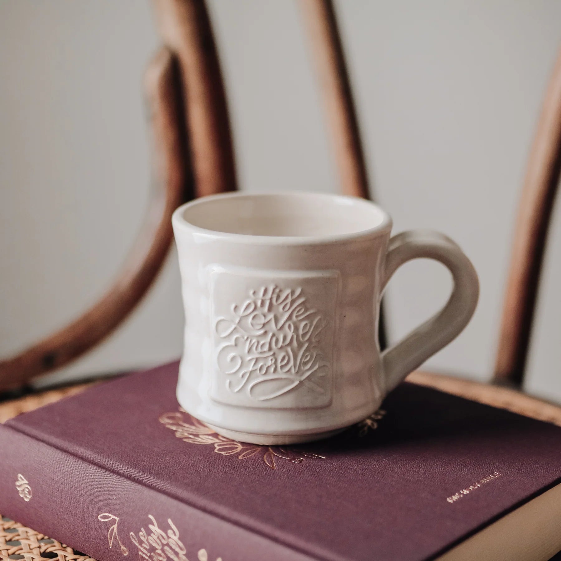 Introducing The Daily Grace Co.'s first custom pottery mug! They created this mug to be a beautiful cream-colored piece with an original script imprint from Psalm 136:2 , which reads, “His love endures forever”. Use this mug as a part of your daily morning routine, or give one to a friend!