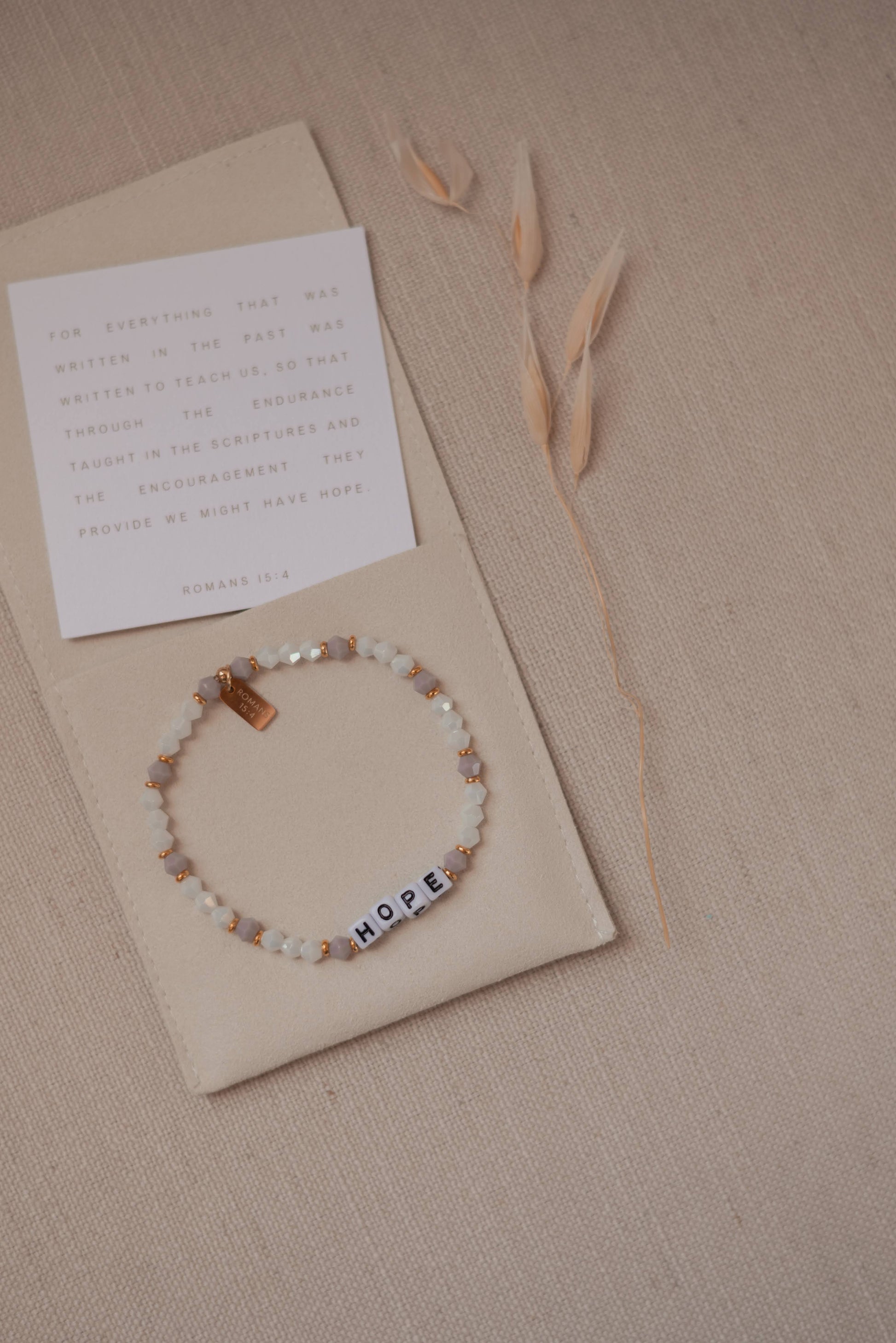 -tiny cotton card with scripture reference inside the pouch with bracelet