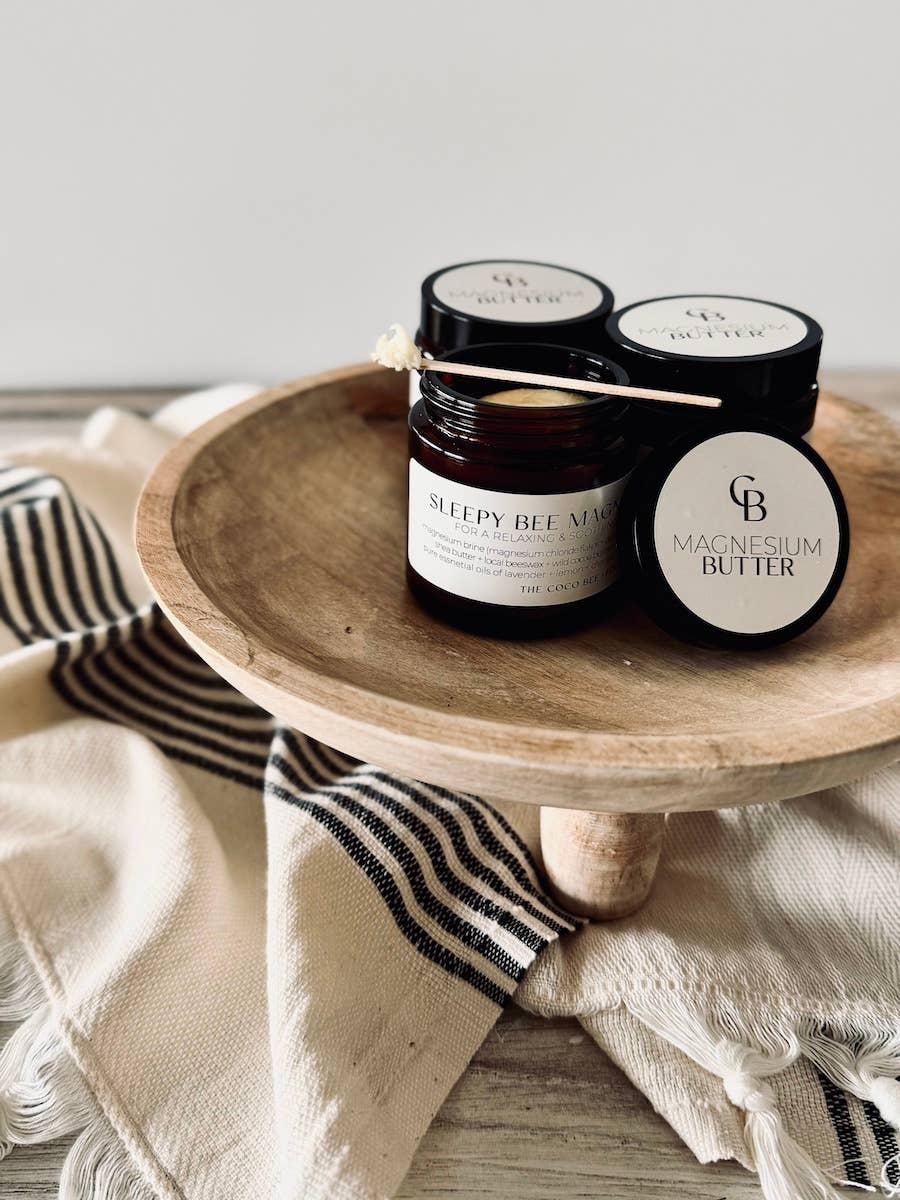 magnesium brine (magnesium chloride flakes + distilled water) + organic avocado oil + organic & unrefined shea butter + locally sourced beeswax + wild cocoa butter + tamanu oil + marula oil + pure vitamin e + pure essential oils. discard after six months of use.