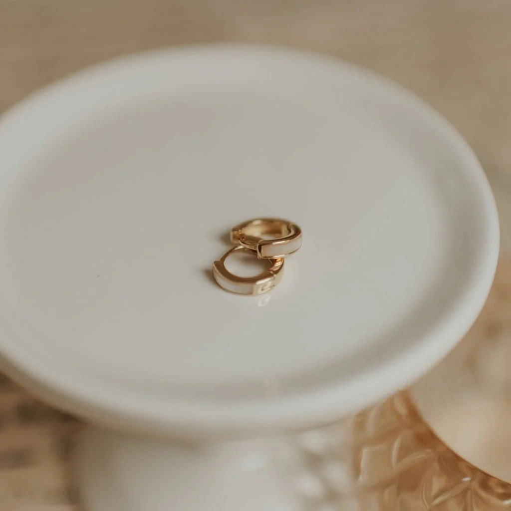The Ruth Mother of Pearl Hoops are the perfect accessory for any outfit. Available in high quality gold vermeil, these huggies are hypoallergenic, good for sensitive skin, and wear and tarnish resistant.