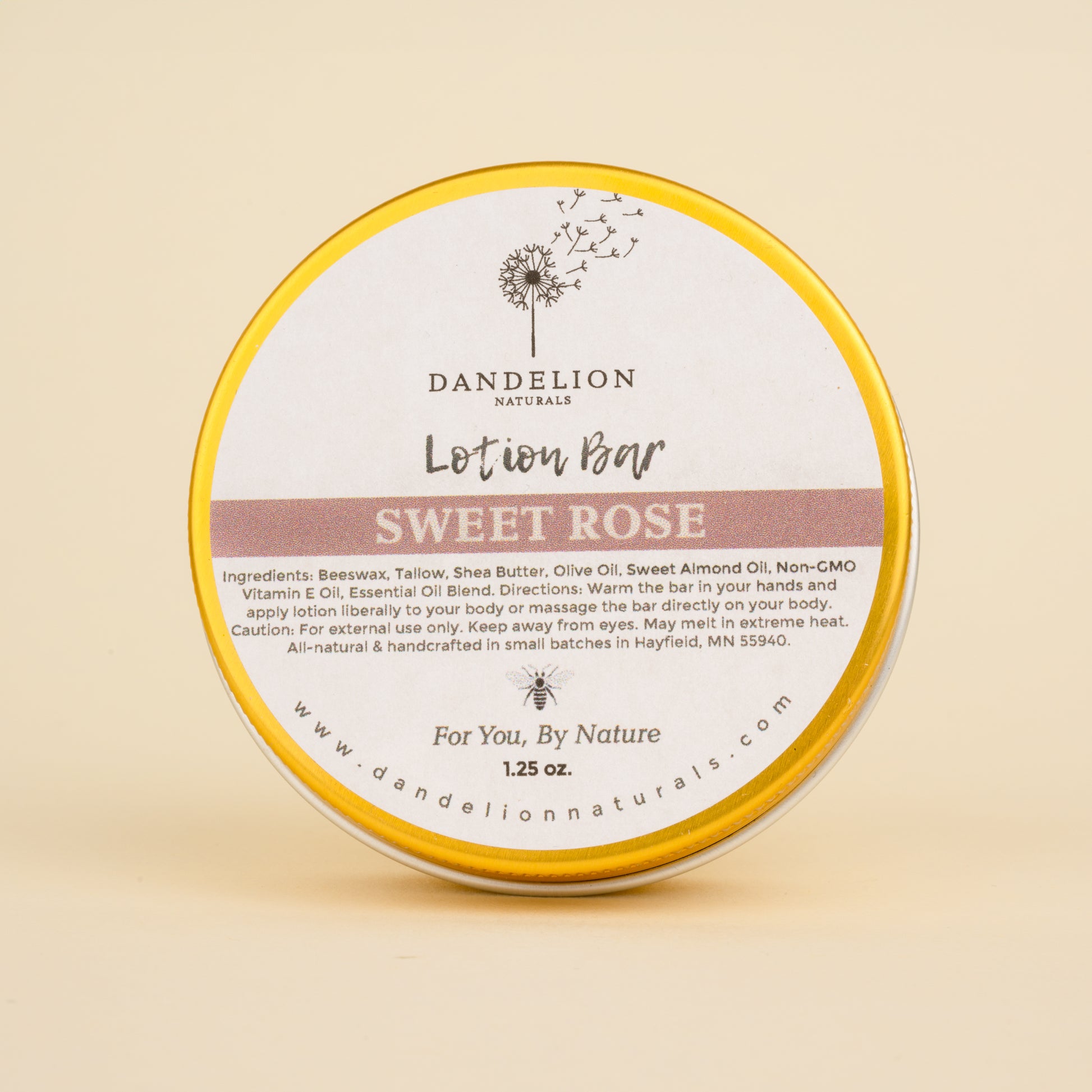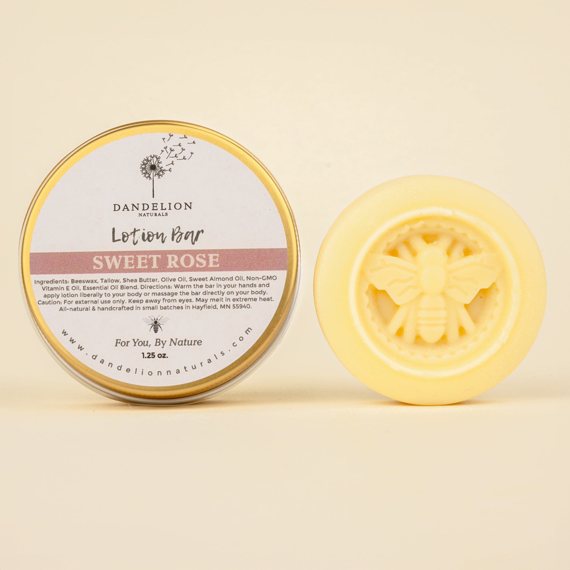 Our lotion bars are 1.25 oz. and come in a 2 oz. tin with removable screw top lid. Handmade in small batches at our studio in Minnesota. This product is free of petrolatum or petroleum jelly, preservatives, parabens, phthalates, and fragrance oils.