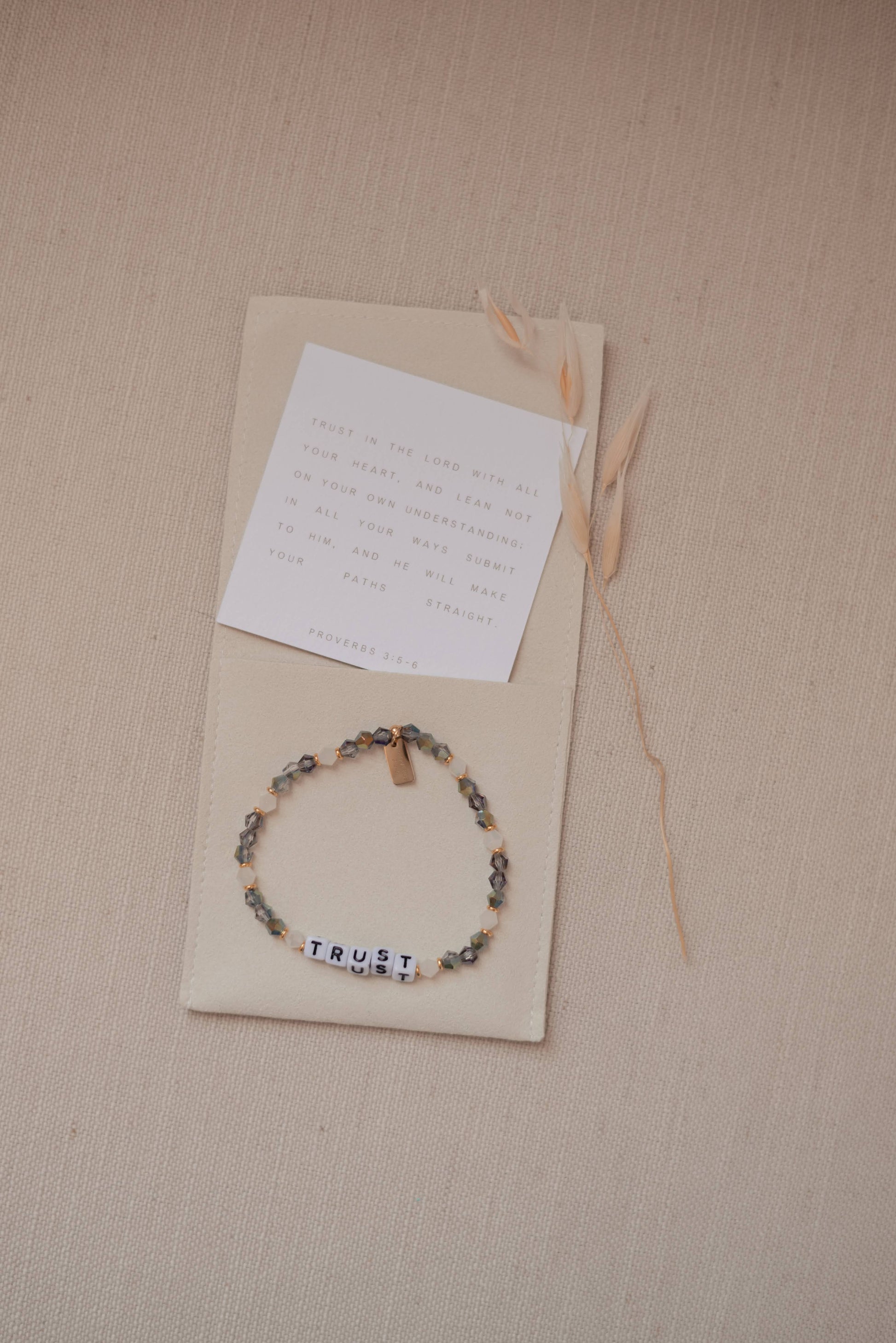 -tiny cotton card with scripture reference inside the pouch with bracelet