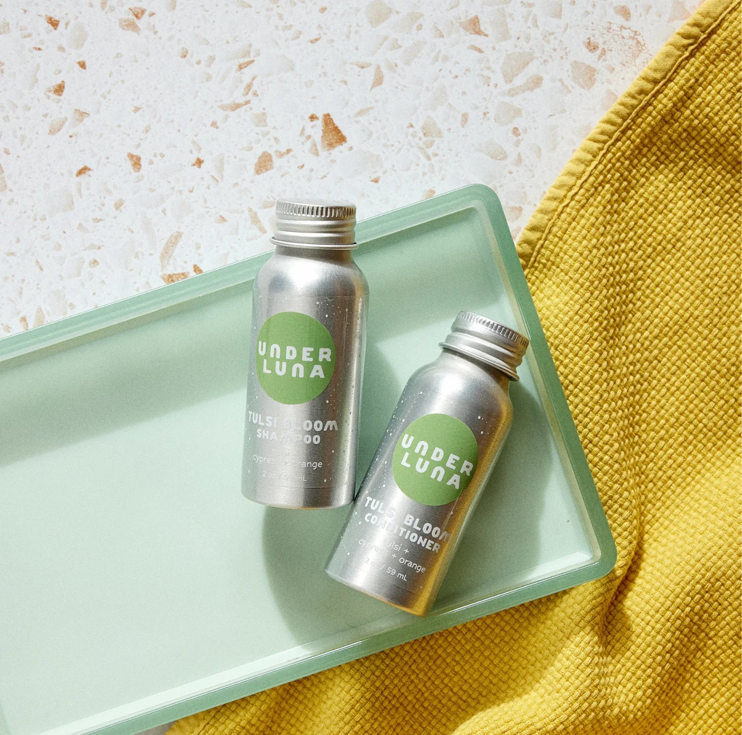 2oz + 9.5 oz: Made from infinitely recyclable aluminum, these bottles are as kind to the planet as they are protective of your conditioner. A safe inner barrier keeps the ingredients pure and never in contact with the aluminum.